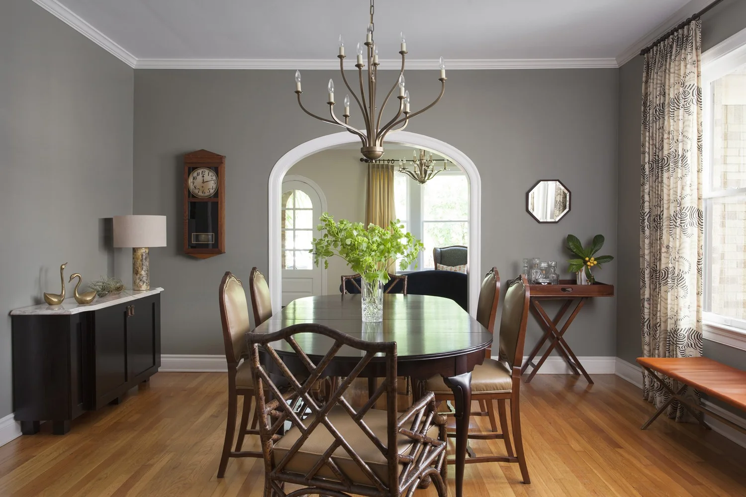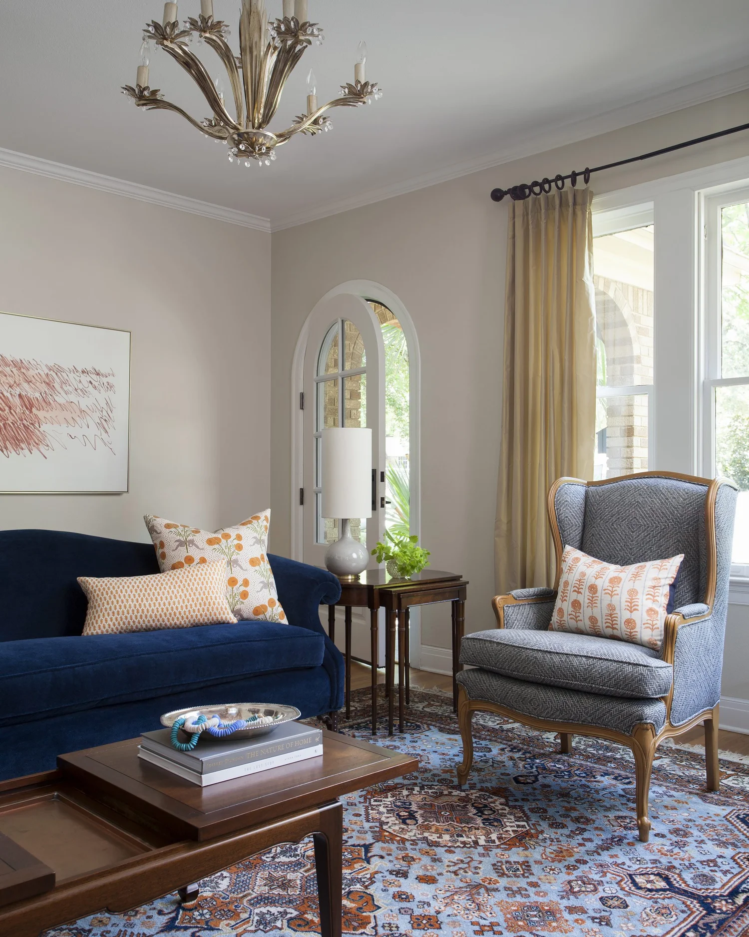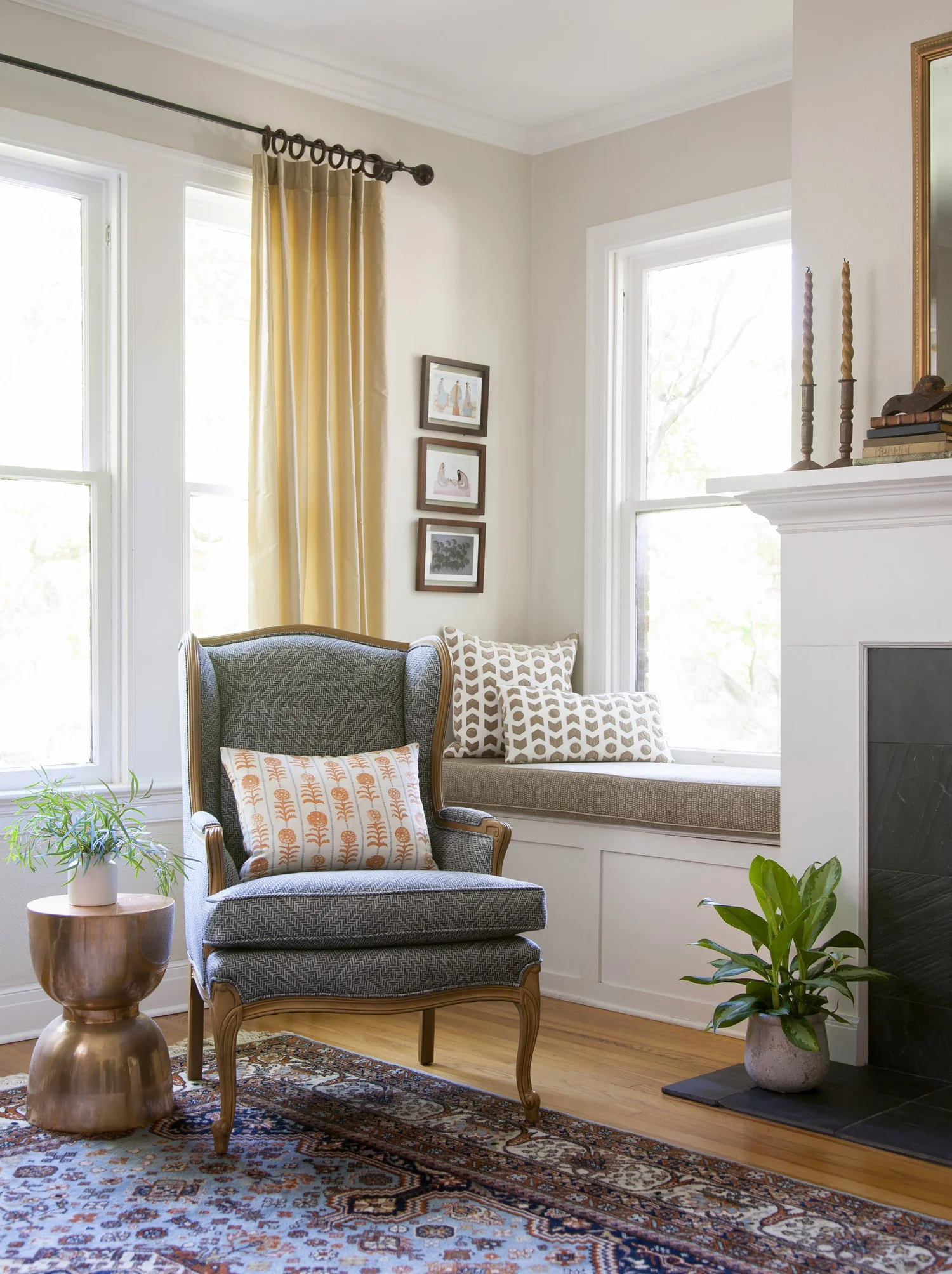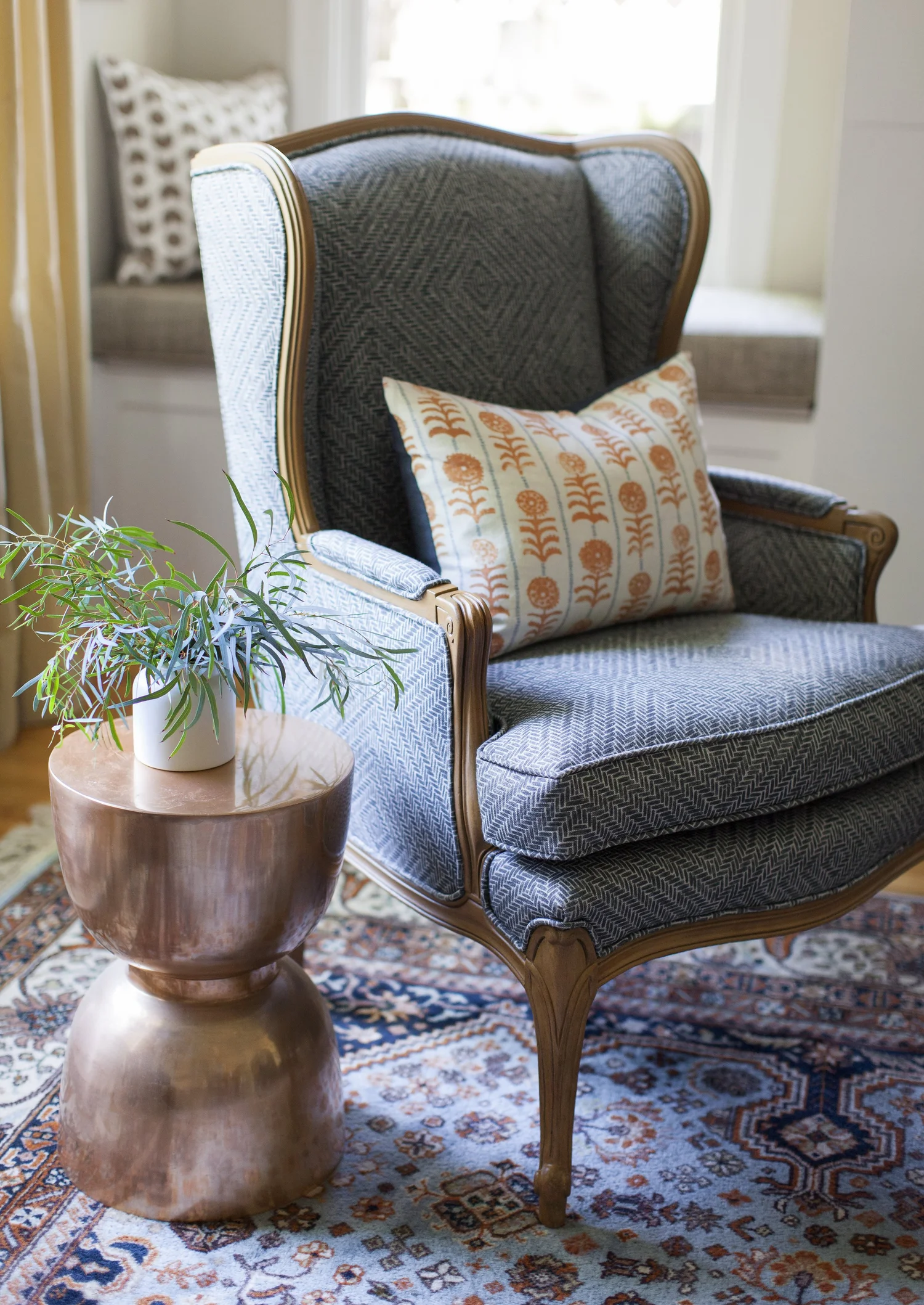 This 1937 brick Tudor-Revival-style home is filled with antique and vintage furniture inherited from our clients’ family. Using colors from a rich-hued vintage rug to guide the palette, we recovered, refinished and rejuvenated the furnishings, playing with pattern, scale and texture.