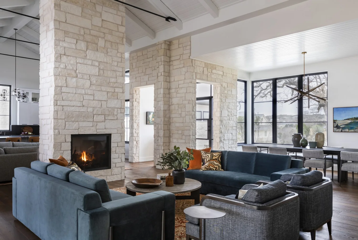 Strong indoor-outdoor connections and a well-considered floor plan establish a clear balance between public and private spaces, allowing for togetherness and retreat. Throughout, durable, comfortable furnishings blend the homeowners’ cherished traditional pieces—many thoughtfully reworked—with fresh, transitional furnishings that feel tailored yet relaxed. Integrated storage supports a clutter-free, highly livable home that encourages ease, connection, and everyday elegance.
